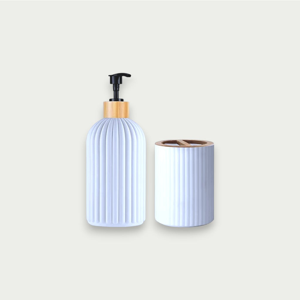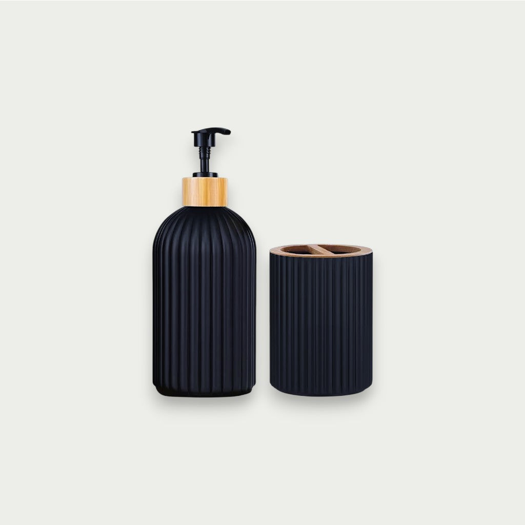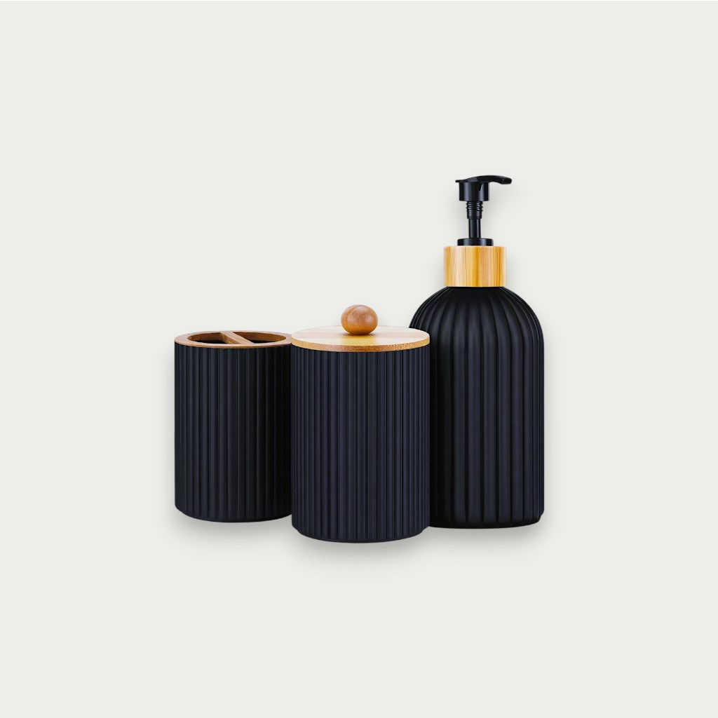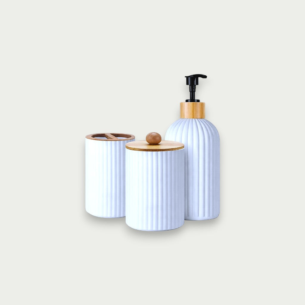 Com diâmetro de 7,5 cm, as peças apresentam alturas de 19,5 cm, 12,3 cm e 11 cm, formando um conjunto elegante que une funcionalidade e design contemporâneo para banheiros sofisticados.